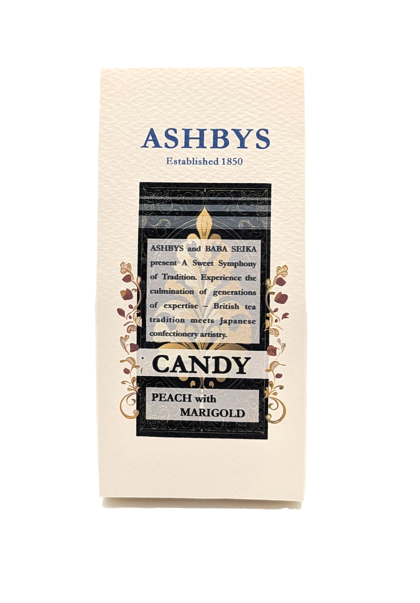 創業が天保年間の馬場製菓さんと1750年のASHBYS。約180年の歴史を足し算した飴ができあがりました。 「英国紅茶ブランドASHBYSの華やかなフレーバーと、創業天保年間の伝統を誇る馬場製菓の技が織りなす、最高級の飴です。ピーチのフルーティーな香りとマリーゴールドの優雅な彩りが、まるで時間を超えたマリアージュをお届けします。日本の匠が伝統と現代の味わいを融合させた、特別なひと粒を今すぐお試しください。」